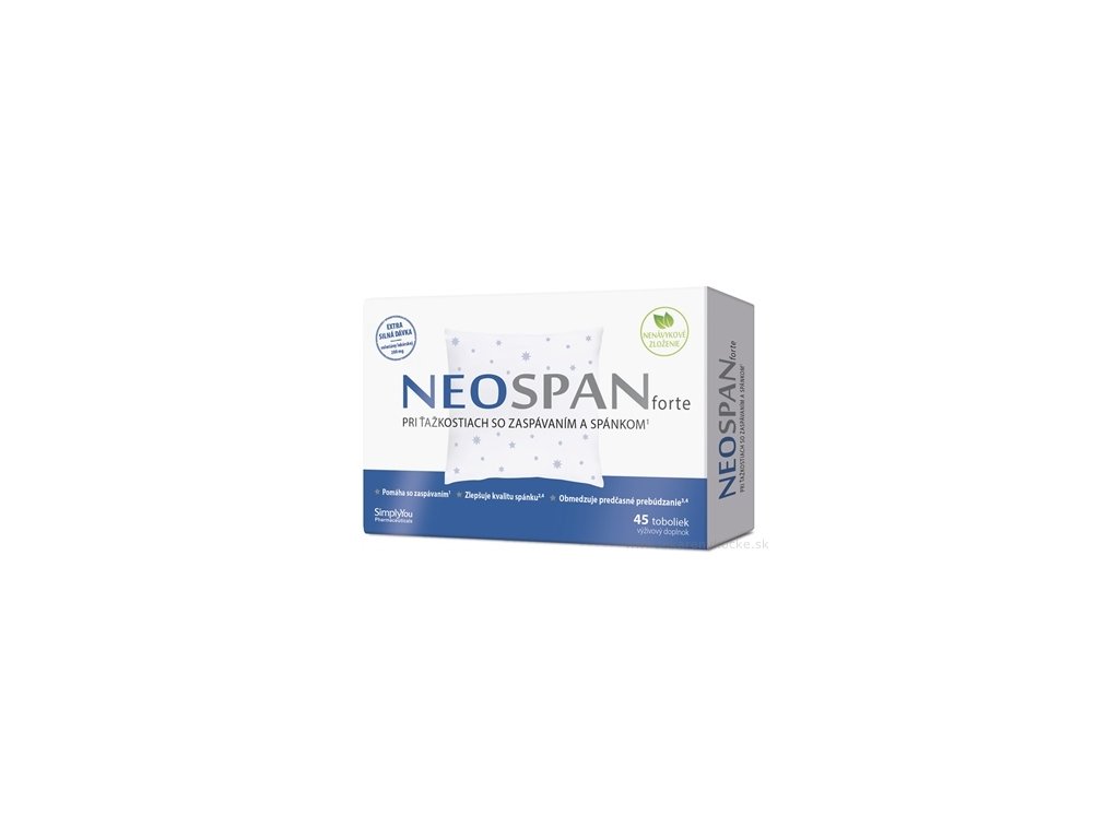 Neospan Forte je doplněk stravy navržený na podporu snazšího usínání a zlepšení kvality spánku. Obsahuje kombinaci přírodních rostlinných složek, jako jsou kozlík lékařský, meduňka lékařská, mučenka oplétavá, chmel obecný, heřmánek pravý a olej z pomerančovníku hořkého. Tyto složky se tradičně používají k podpoře relaxace, snížení nervozity a uvolnění, což vede k lepšímu a kvalitnějšímu spánku.