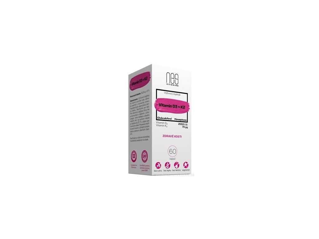 Doplněk stravy nesVITAMINS Vitamin D3 2000 I.U. + K2 70 μg je: bez cukru, bez lepku, bez laktózy, vegetarian.