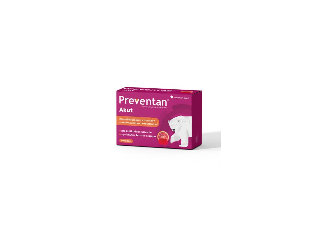 Preventan® Akut s příchutí brusinek a grapu. Obsahuje originální aktivní látku ProteQuine® (aminokyseliny, oligopeptidy, nukleotidy) a vitamin C. Pro akutní užívání.