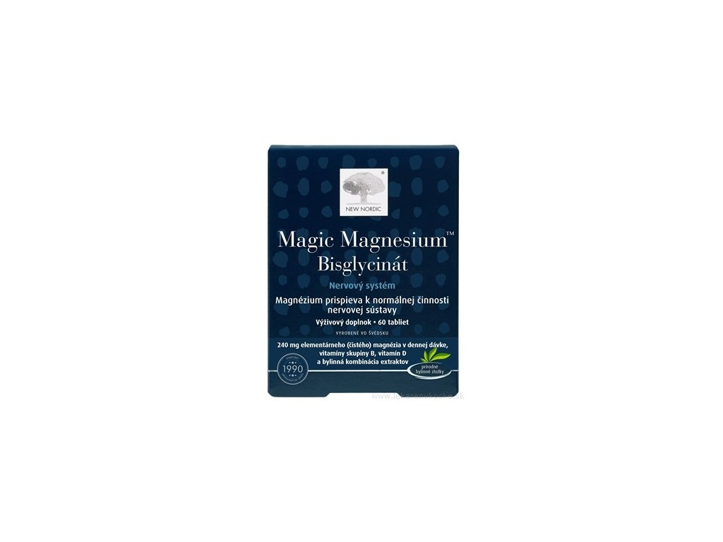 NEW NORDIC Magic Magnesium Bisglycinát je výživový doplněk ve formě tablet, který obsahuje hořčík ve formě bisglycinátu doplněný o vitamíny skupiny B, vitamín D3 a rostlinné extrakty. Kombinace pečlivě vybraných složek je určena k podpoře nervové soustavy, psychologické funkce, svalů, kostí a energetického metabolismu.