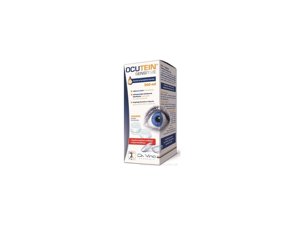 OCUTEIN SENSITIVE roztok na kontaktní čočky 360 ml je zdravotnická pomůcka s kombinací hyaluronátu sodného a hypromelózy, ideální pro dezinfekci, čištění, uchovávání, hydrataci a lubrikaci všech měkkých kontaktních čoček.