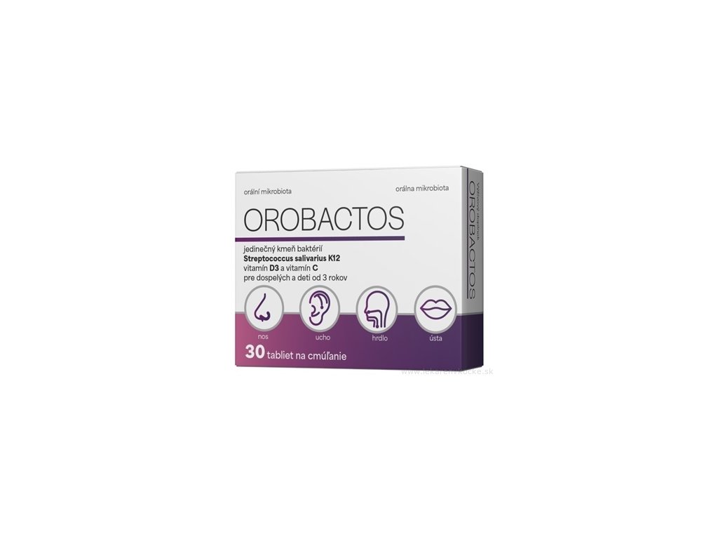 OROBACTOS - orální probiotikum, obsahuje kmen Streptococcus salivarius K12, vitamín C a vitamín D. Streptococcus salivarius K12 přirozeně kolonizuje ústní dutinu, horní dýchací cesty, nosohltan a střední ucho. OROBACTOS vytváří prospěšné mikrobiální prostředí v ústech, čímž účinně brání růstu a šíření škodlivých mikroorganismů.