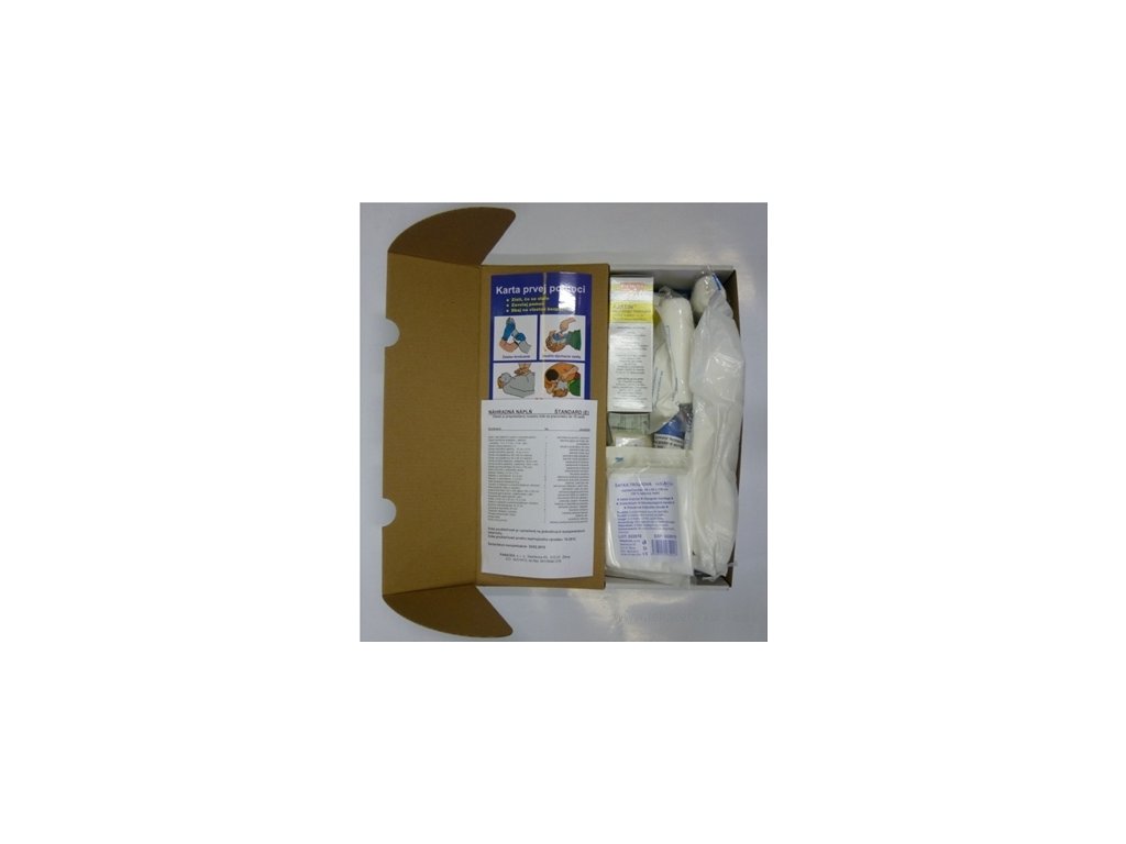 Náplň do nástěnné lékárničky - sada sterilních a nesterilních zdravotnických pomůcek. Obsah lékárničky je přizpůsoben rozsahu rizik na pracovišti a v domácnosti, do 15 osob. Balení obsahuje také kartu první pomoci. Určeno pro poskytnutí ošetření, případně první předlékařské pomoci.