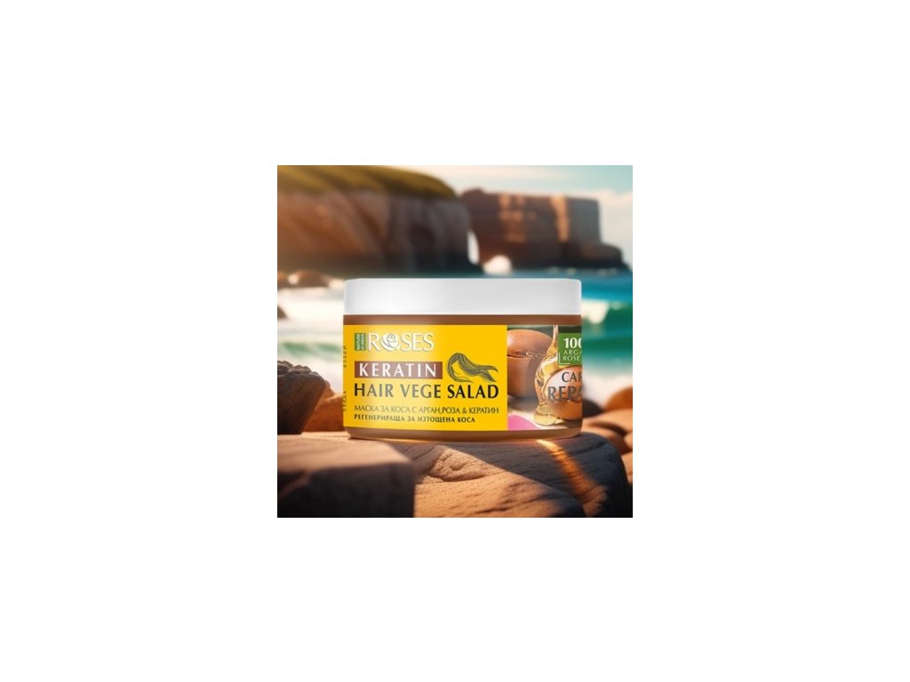Objevte sílu přírodní regenerace s ROSES VEGE SALAD Regenerační maskou na vlasy s arganovým olejem, růžovým olejem a keratinem. Tento intenzivně vyživující produkt je speciálně navržen pro potřeby poškozených, suchých a lámavých vlasů, kterým navrací ztracenou vitalitu, pevnost a přirozený lesk. Díky inovativnímu složení bohatému na 100% přírodní oleje a keratin se maska stará o vlasy od kořínků až po konečky – bez jejich zatížení.