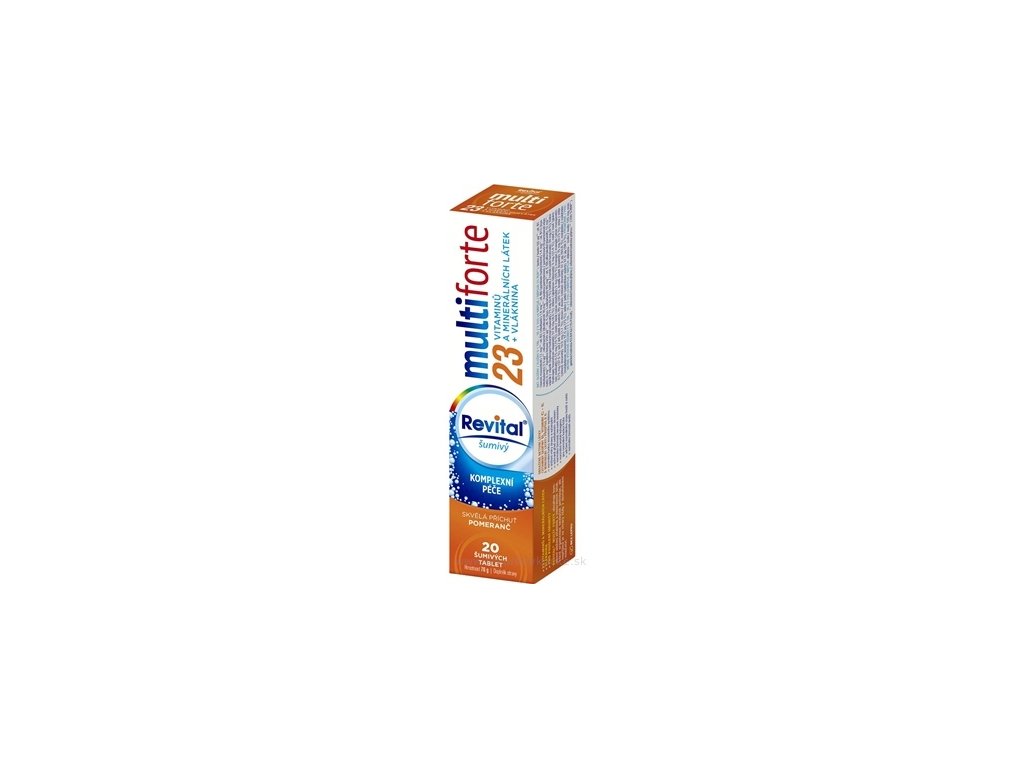 Doplněk stravy Revital® multiforte šumivý – vitaminové tablety s minerálními látkami + vláknina s příchutí pomeranč. Obsahuje komplexní složení vitamínů a minerálních látek, které organismus potřebuje, ale nepřijímá ze stravy vždy v dostatečném a potřebném množství.