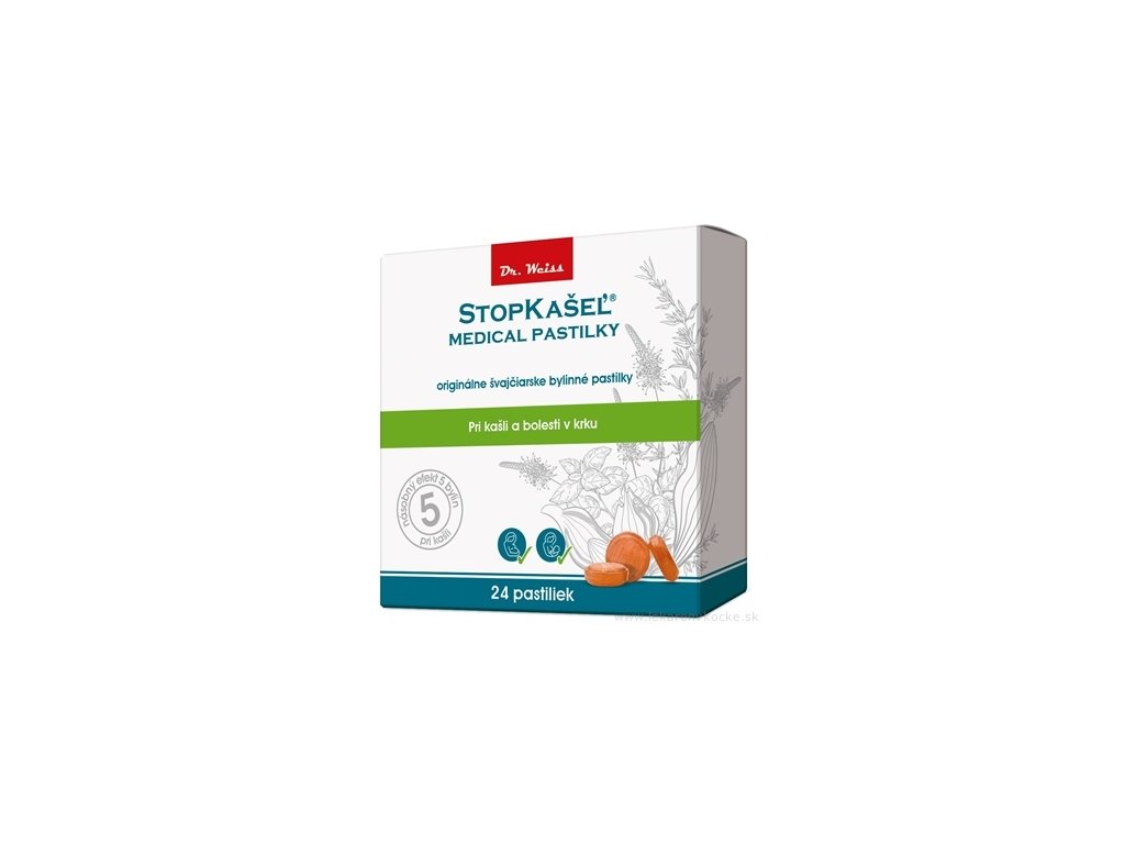 STOPKAŠEL Medical pastilky Dr. Weiss obsahují přírodní účinné látky, které pomáhají zmírnit příznaky běžných onemocnění spojených s nachlazením jako je suchý a vlhký kašel, bolest v krku a chrapot. Pastilky vytvářejí ochrannou vrstvu na sliznici úst a hrdla. Tímto způsobem přípravek zmírňuje podráždění a kašel a snižuje pocit škrábání v krku. Přípravek je vhodný pro celiatiky a mohou jej užívat těhotné i kojící ženy.