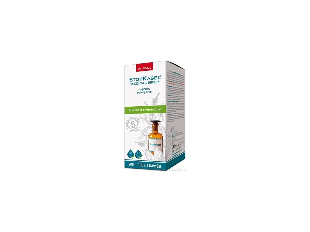 Zdravotnická pomůcka STOPKAŠEL Medical sirup Dr. Weiss obsahuje přírodní účinné látky, které pomáhají zmírnit příznaky běžných chorob spojených s nachlazením jako je kašel a chrapot. Sirup vytváří ochrannou vrstvu na sliznici úst a hrdla. Tímto způsobem přípravek zmírňuje podráždění a kašel a snižuje pocit škrábání v krku. Přípravek je vhodný pro alergiky, celiatiky a diabetiky (slazený fruktózou a sukralózou), mohou jej užívat těhotné a kojící ženy (obsahuje výběr bezpečných bylin).