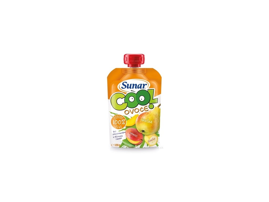 Sunar Cool ovoce hruška, mango, banán. Ovocný příkrm, mix 3 druhů 100% ovocného pyré, pro děti od ukončeného 12. měsíce věku. Pasterizované. Skvěle zasytí a doplní vitamíny. Neobsahuje přidaný cukr.