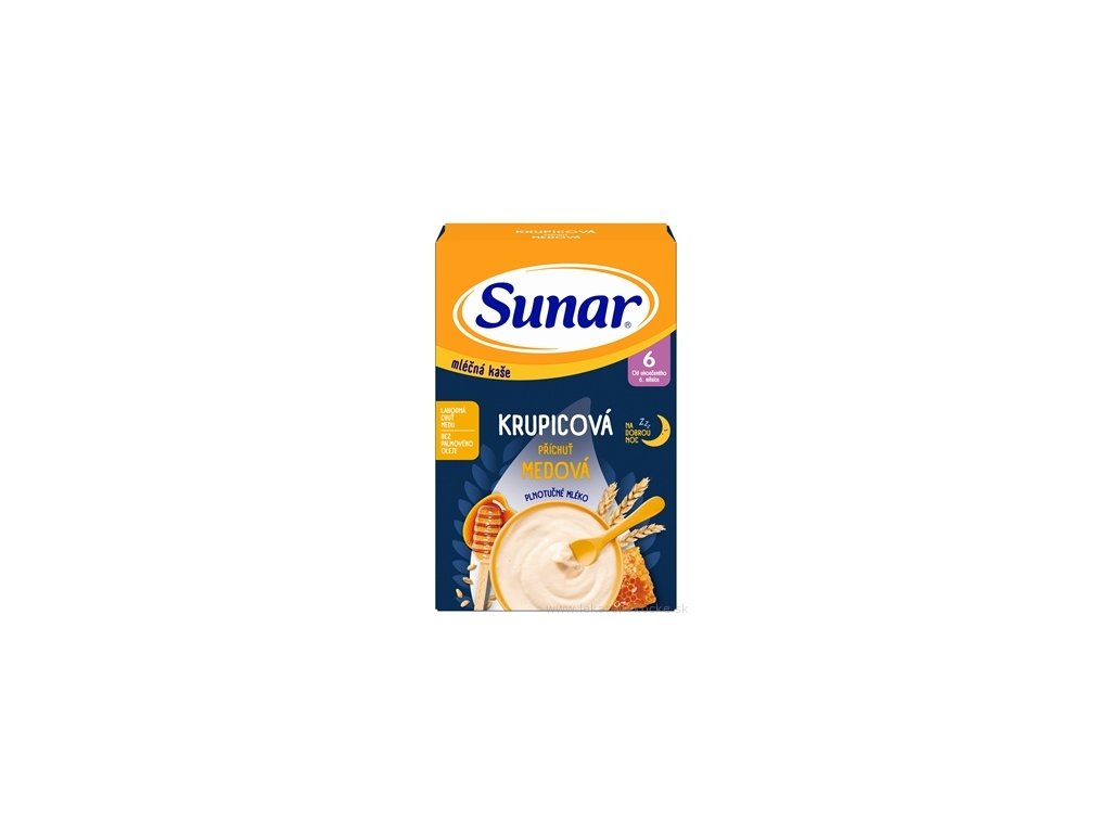 Sunar krupicová mléčná kaše na dobrou noc s obsahem plnotučného mléka skvěle chutná a zajistí spokojené bříško před spaním. Obsahuje lepek, vhodné pro děti od ukončeného 6. měsíce.