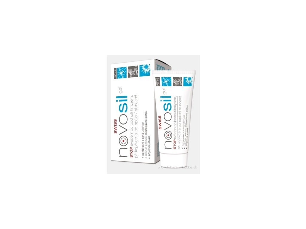 Novosil gel SWISS je unikátní přípravek, který díky extraktu z boswellie a křídlatky (resveratrol) eliminuje rozvoj negativních reakcí po bodnutí hmyzem, při kopřivce a po spálení sluncem. Dále obsahuje šalvějovou a žebříčkovou silici, které udržují místo aplikace mikrobiálně čisté. Přípravek je také obohacen o extrakt z očíanky, mentol s bazalkovou silicí.