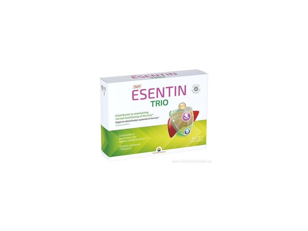 SWP ESENTIN TRIO je výživový doplněk ve formě tablet, určený k pravidelnému užívání po jídle. Balení obsahuje 30 tablet. Produkt kombinuje silymarin, lecitin a vitamín E. Součástí složení jsou esenciální fosfolipidy (lecitin), které slouží jako přirozený nosič silymarinu. Vitamin E přispívá k ochraně buněk před oxidačním stresem.