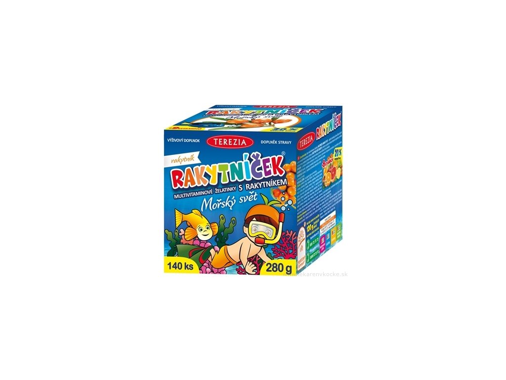 Nové multivitamínové želatinky RAKYTNÍČEK MOŘSKÝ SVĚT – příchuť rakytník obsahují účinnou látku rakytník a směs ovocných koncentrátů a vitamíny. RAKYTNÍK ŘEŠETLÁKOVÝ je vhodný pro podporu obranyschopnosti organismu, pomáhá snižovat únavu, podporuje činnost srdce a trávicího traktu, pomáhá udržovat zdravou pokožku.