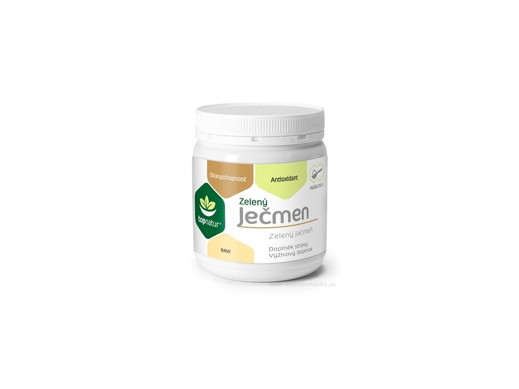 ZELENÝ JEČMEN značky je vyroben ze sušených lístků mladého ječmene. Mladý zelený ječmen je svým vzhledem a chutí řazen mezi tzv. zelené potraviny jako jsou chlorella a spirulina. Stejně jako tyto látky se zelený ječmen vyznačuje bohatým obsahem minerálů (selen, jód, měď) a vitamínů (vitamín A, vitamín C, vitamín B 12). Díky svému zásaditému pH pomáhá také obnovovat acido-alkalickou rovnováhu v těle.
