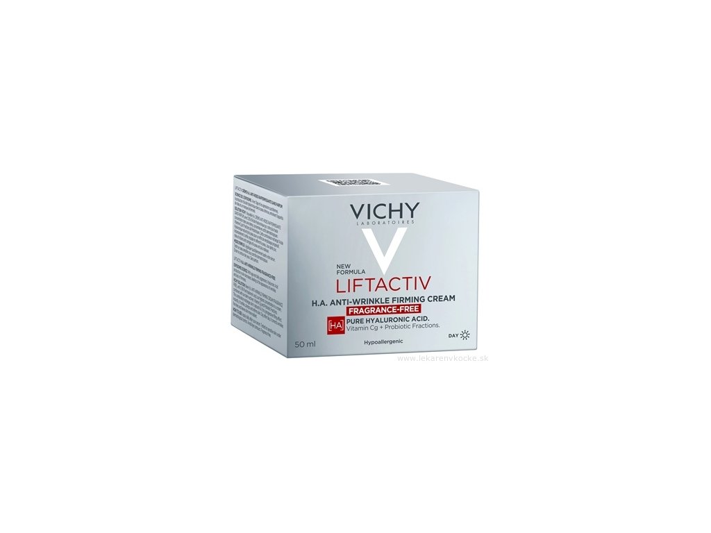 VICHY Liftactiv H.A. zpevňující krém proti vráskám - bez parfemace. VĚDA O EXPOSOMU: S postupujícím věkem a každodenním působením agresorů klesá produkce kyseliny hyaluronové v pokožce, což vede ke vzniku vrásek a ztrátě pevnosti pleti. ŘEŠENÍ VICHY: Novinka H.A. ZPEVŇUJÍCÍ KRÉM PROTI VRÁSKÁM – BEZ PARFUMACE s 0,5 % čisté kyseliny hyaluronové v kombinaci s vitamínem Cg a probiotickými frakcemi. Doplňuje hladinu kyseliny hyaluronové v pokožce a má vyplňující účinek. Po aplikaci pleť působí více tonizovaná a pevnější. Koriguje vzhled vrásek a jemných linek, pleť působí více rozjasněná.
