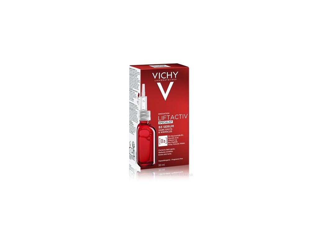 VICHY Liftactiv Specialist B3 Sérum proti pigmentovým skvrnám a vráskám. Věda o exposomu: Stárnutí a vnější faktory, jako jsou znečištěné ovzduší a UV záření, mohou vést k tvorbě pigmentových skvrn, vrásek a nejednotnému odstínu pleti. Řešení od Vichy: B3 Sérum, ypoalergenní složení s posilující Termální vodou Vichy vulkanického původu a koncentrovanými aktivními látkami: 5 % niacinamidu (vitaminu B3), kyselinou glykolovou, vitaminem Cg a bio-peptidem, snižuje viditelnost pigmentových skvrn. Pleť je vyhlazená a zářivá.