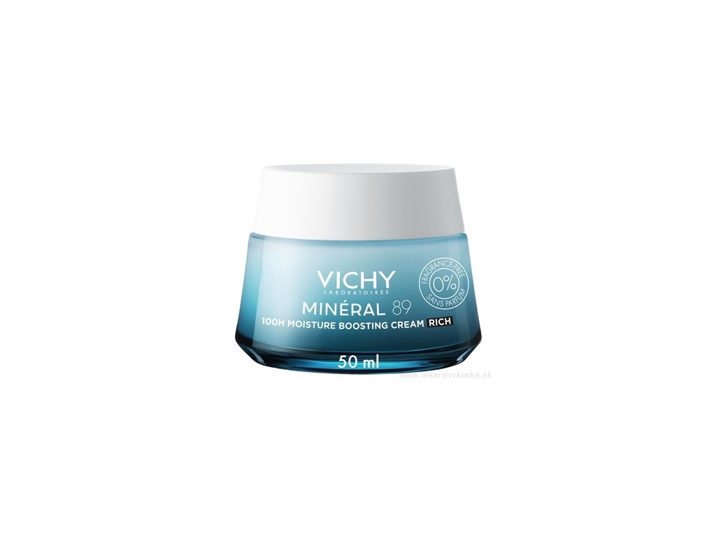 VICHY MINERAL89 100H krém pro podporu hydratace RICH - bez parfému s čistou kyselinou hyaluronovou a minerály. VĚDA O EXPOSOMU: Hydratační bariéra vaší pleti je oslabena v důsledku každodenní expozice agresorům, tím se v pokožce denně zvyšuje ztráta vody, minerálů, lipidů, vitamínů a kyseliny hyaluronové. ŘEŠENÍ VICHY: Laboratoře Vichy poprvé koncentrují pro pleť zásadní prvky a vysokou koncentrací lipidů přírodního původu v bohatém rozbředlém krému. Působí jako druhá kůže, doplňuje a obnovuje hydratační kožní bariéru a zajišťuje dlouhotrvající posilující hydrataci až po dobu 100 hodin.