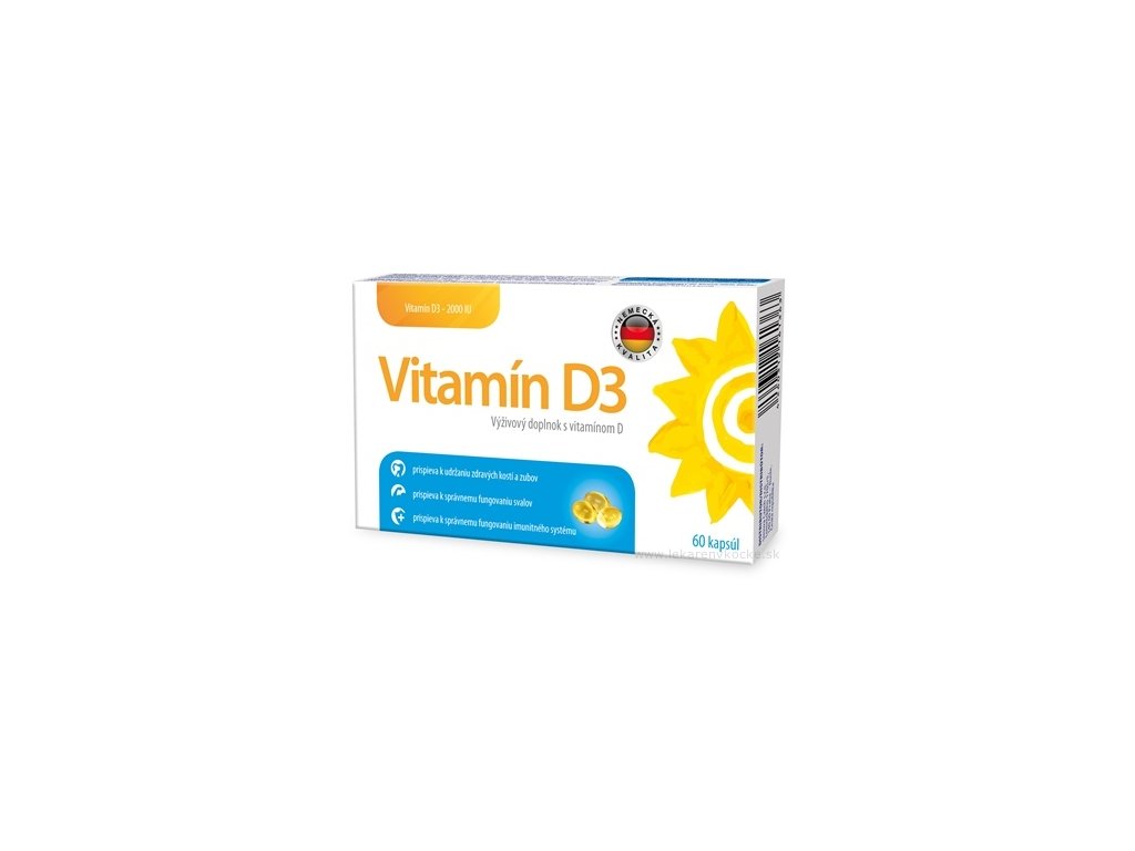 Doplněk stravy s vitamínem D3-2000 IU. Vitamin D3 se tvoří v kůži působením slunečního záření. Vitamin D přispívá k udržení zdravých zubů a kostí, podporuje správné vstřebávání a využití vápníku a fosforu a přispívá k normální hladině vápníku v krvi. Vitamin D také napomáhá ke správnému fungování imunitního systému a svalů.