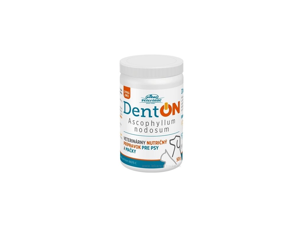 VITAR Veterinae DentON sypká směs 50 g je přírodní veterinární přípravek určený k udržování ústní hygieny u psů a koček. Tento doplněk výživy obsahuje mořskou řasu Ascophyllum nodosum, která působí zevnitř – z trávicího traktu se dostává do krevního oběhu a následně do slin, kde pomáhá eliminovat bakterie zodpovědné za tvorbu plaku, kamene a nepříjemného zápachu z tlamy.
