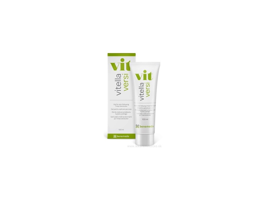 Tinea versicolor se projevuje světlými nebo tmavými skvrnami na pokožce, které vznikají v důsledku infekce vyvolané Malassezia furfur. Vitella Versi obsahuje octopirox a ichtyol pale.