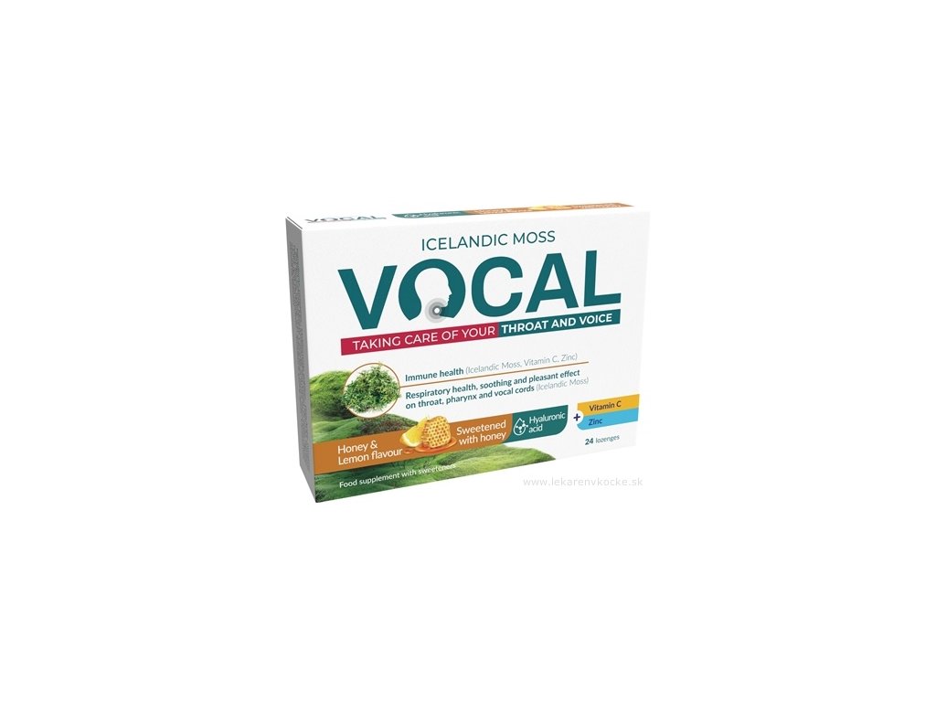 Vocal HA obsahuje kombinaci islandského lišejníku, vitamínu C, kyseliny hyaluronové a zinku. Lišejník islandský (Cetraria islandica) působí příznivě na zdraví dýchacích cest. Podporuje zdraví sliznice úst a hrdla. Vitamin C a zinek prospívají ke správné funkci imunitního systému ak ochraně buněk před oxidačním stresem. Zinek hraje roli v procesu dělení buněk.
