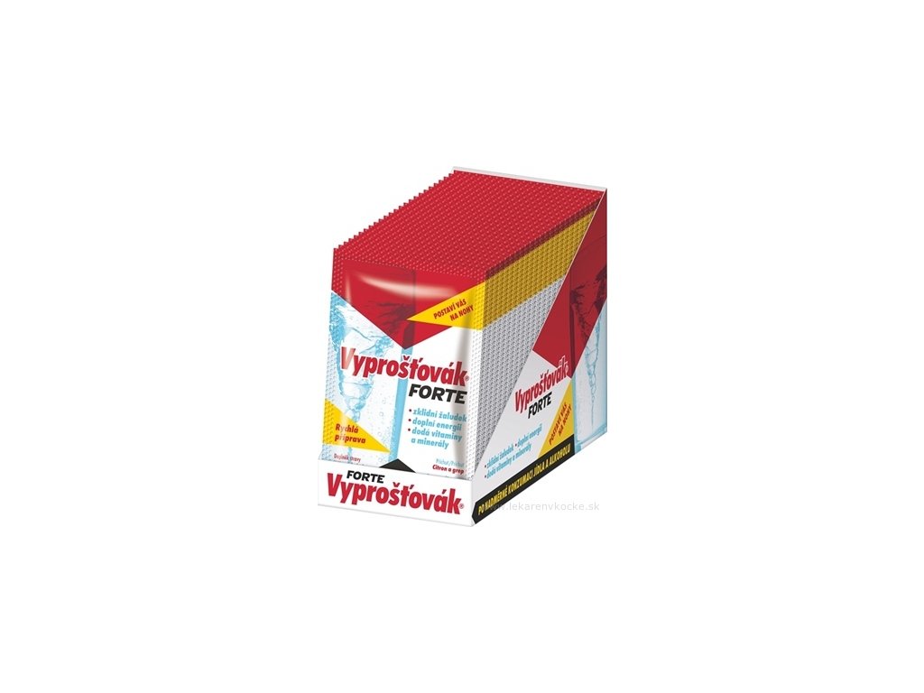 Vyprošťovák FORTE je doplněk stravy ve formě prášku v sáčcích, určený k použití po nadměrné konzumaci jídla a alkoholu. Praktické jednorázové sáčky umožňují snadnou přípravu perorálního roztoku a pohodlné užívání doma i na cestách. Přípravek je zařazen mezi výživové doplňky a je vhodný pro dospělé a děti od 12 let.