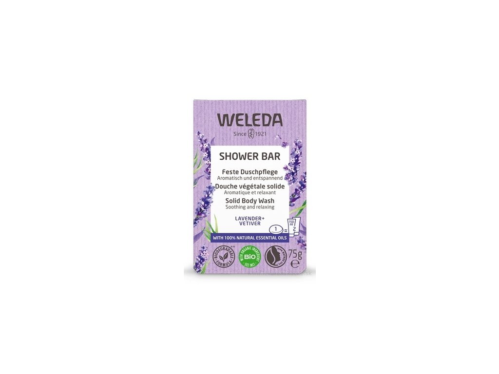WELEDA SHOWER BAR Levandulové relaxační mýdlo je 100% přírodní rostlinné mýdlo vytvořené pro každodenní šetrnou hygienu a příjemný relaxační rituál při sprchování. Kombinuje uklidňující vůni levandule a zemité tóny vetiveru, které napomáhají uvolnění těla i mysli po celém dni. Mýdlo je obohaceno o pečující bambucké máslo, které hydratuje a zjemňuje pokožku již během mytí.